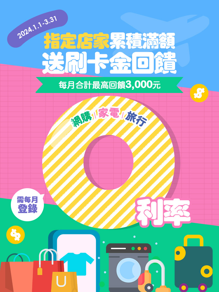 *活動期間內登錄且於國內指定店家刷卡分期付款成功,當月累積滿額即可享刷卡金回饋!