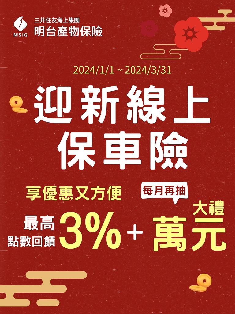 - 第三重優惠: 【明台投保抽萬元好禮】 抽獎活動:活動期間(2024/1/1~2024/3/31)前往明台產險網路投保車險(強制險+任意險+選擇電子保單)或是旅遊險(單筆保費滿800元)即可獲得抽獎資格: