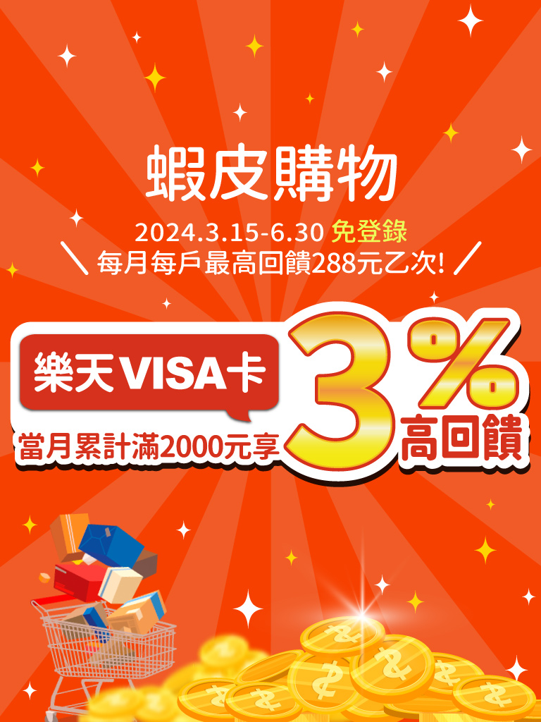 *活動期間內VISA卡友於蝦皮購物當月累計滿2,000元享3%刷卡金回饋,每月歸戶上限288元!(不需登錄)