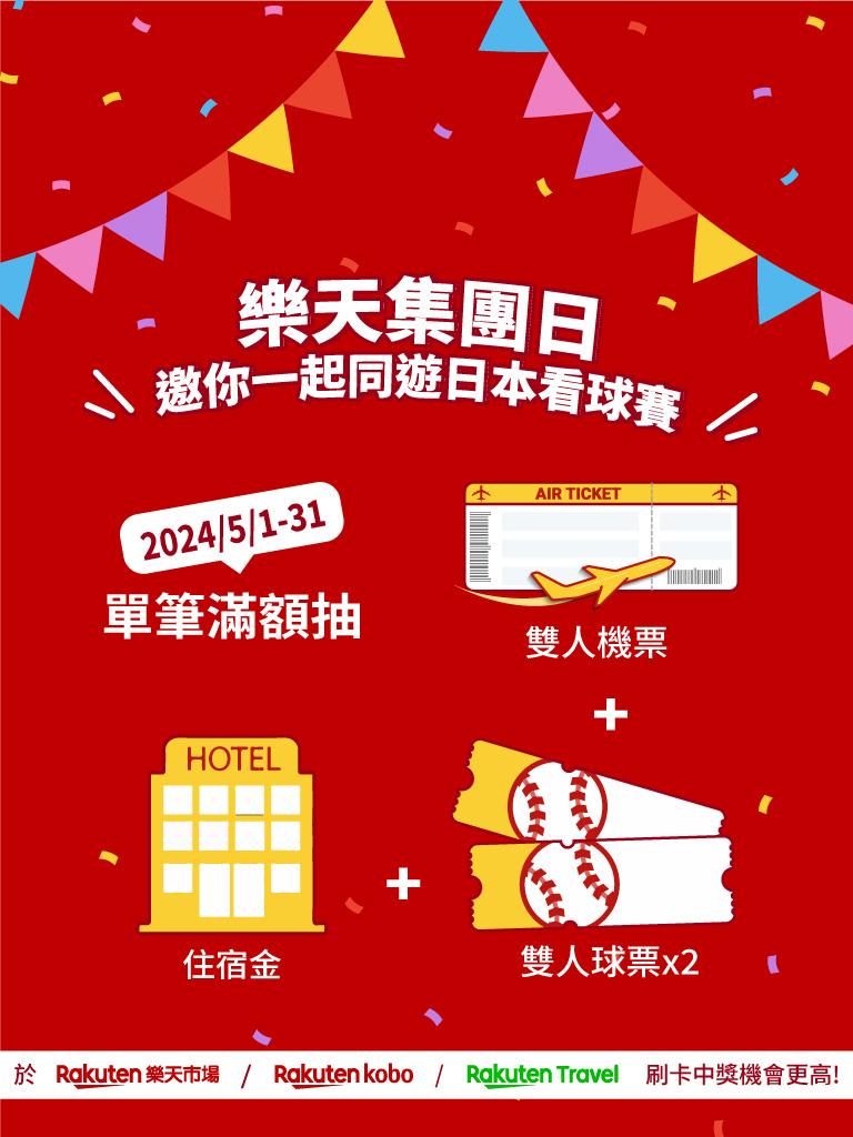 活動期間於下述通路刷樂天信用卡滿額享「樂天集團日抽獎活動機會」,共抽出3名。(一人中獎兩人同行,樂天招待您台灣樂天桃猿比賽球票及東北樂天金鷲比賽球票,並加碼東京機票及住宿。)
