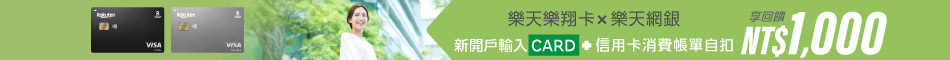 *本活動辦法以及相關注意事項均載明於活動網頁中,參加者須使用台灣樂天信用卡專屬推薦序號「GIFT」 成功完成樂天國際銀行帳戶之開立,且已充分瞭解活動內容並同意樂天國際銀行及台灣樂天信用卡舉辦本活動之需要進行蒐集、處理及利用其個人資料,以利核對參加者之身分並完成回饋作業。