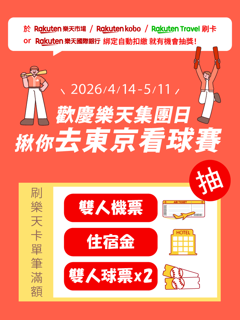 本抽獎活動為機會中獎,一獎獎項共1組【旅遊商品券(限兌換雙人東京來回機票)、樂天旅遊住宿金、雙人東北樂天金鷲vs埼玉西武獅球票】,共抽出1名;二獎獎項共5組【台灣樂天集團日觀賽體驗:雙人樂天桃猿vs統一7-ELEVEn獅球票兌換券】,共抽出5名。中獎人不得要求只領取部分獎品或分次領取。中獎人須申報個人機會中獎所得,依中華民國稅法規定中獎價值超過新臺幣20,000元者,中獎人需自行負擔10%稅額(非中華民國境內居住之個人或總機構在中華民國境外之營利事業,無論金額多寡,依法扣繳20%稅額)並配合本公司辦理代扣繳相關事宜。中獎人須於2026/5/27前完成預繳稅金並與中獎回函一併回傳後,始得領取獎項,獎項一經領取恕無法退還。逾期未寄回或因其他不可歸責於本公司之事由致無法寄送或被退件,則視同放棄領獎資格。