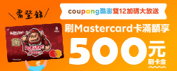 活動期間內登錄活動,並於Coupang刷樂天Mastercard信用卡單筆滿NT10,000元(含)以上,享500元刷卡金回饋。